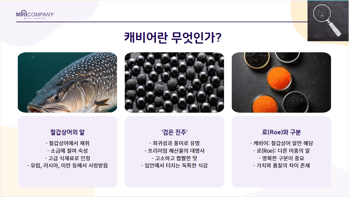 "TIP : 캐비어는 반드시 '철갑상어'의 알이어야 하고 다른 어종의 경우엔 '로(Roe)로 구분하여 불립니다."